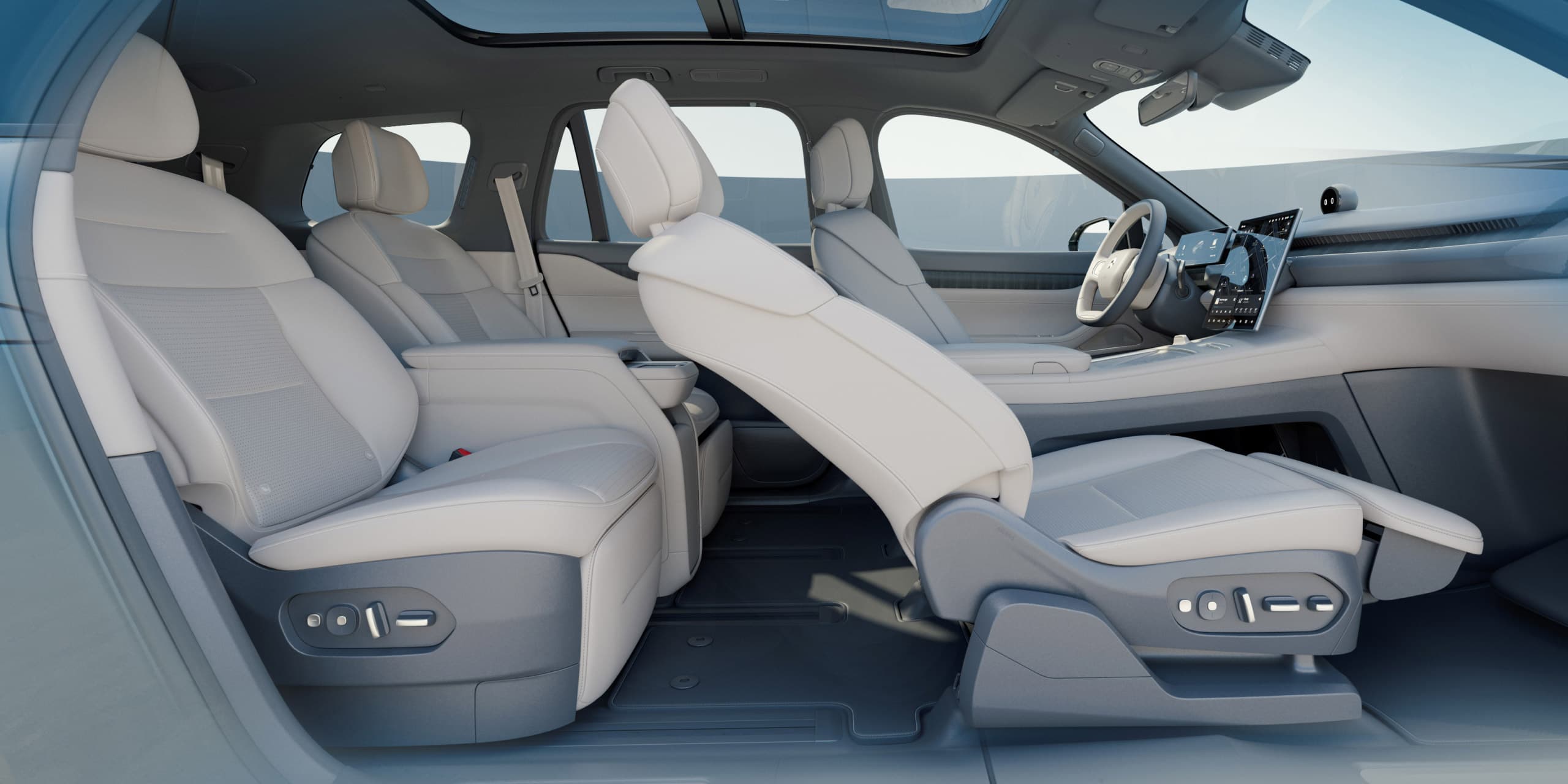 Un pasillo amplio que permite un acceso cómodo a la tercera fila de asientos. Esta configuración incorpora un apoyabrazos ancho para mayor confort y asientos con 14 ajustes eléctricos, además de extensión del cojín del asiento para un nivel superior de comodidad.