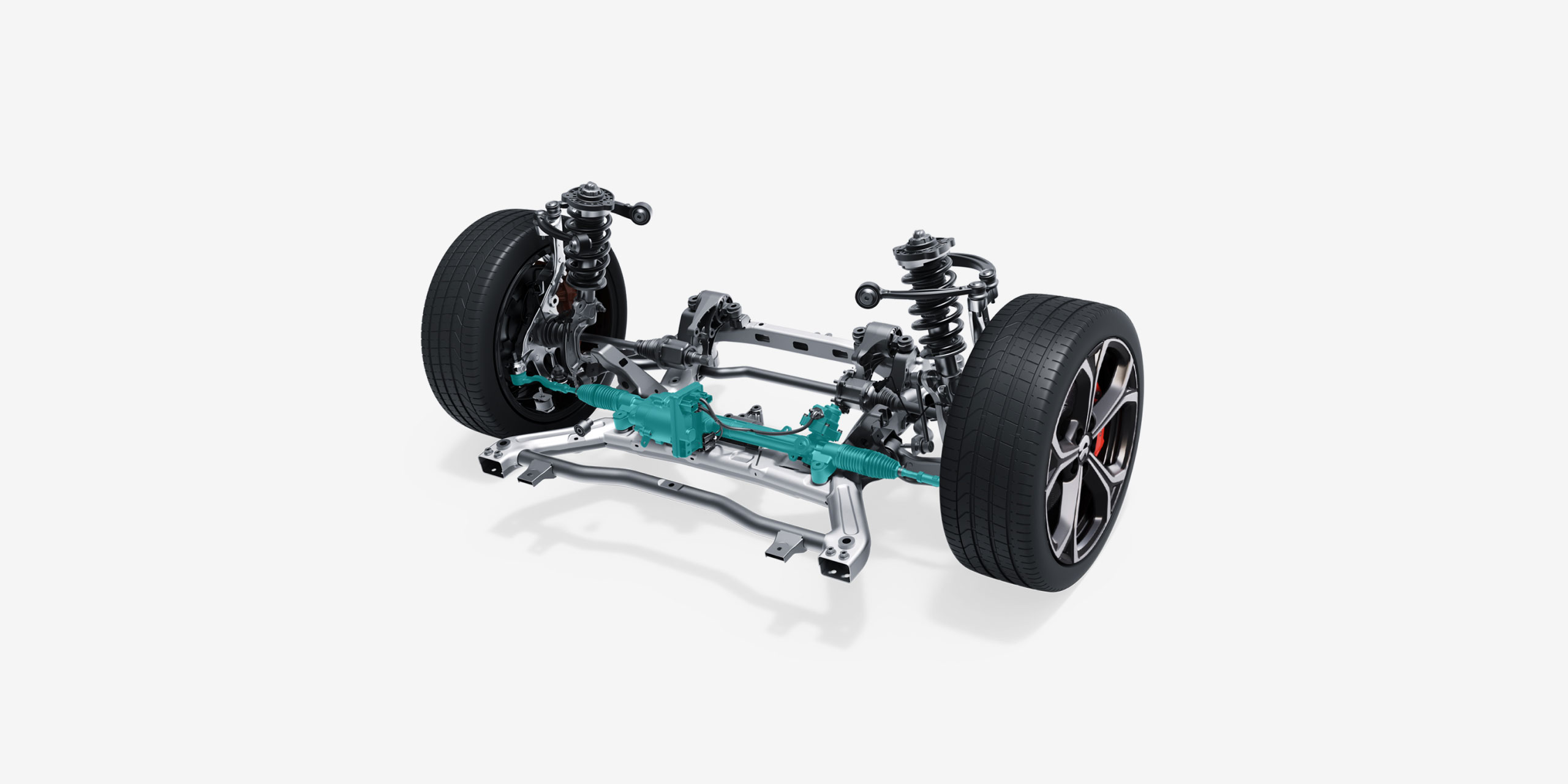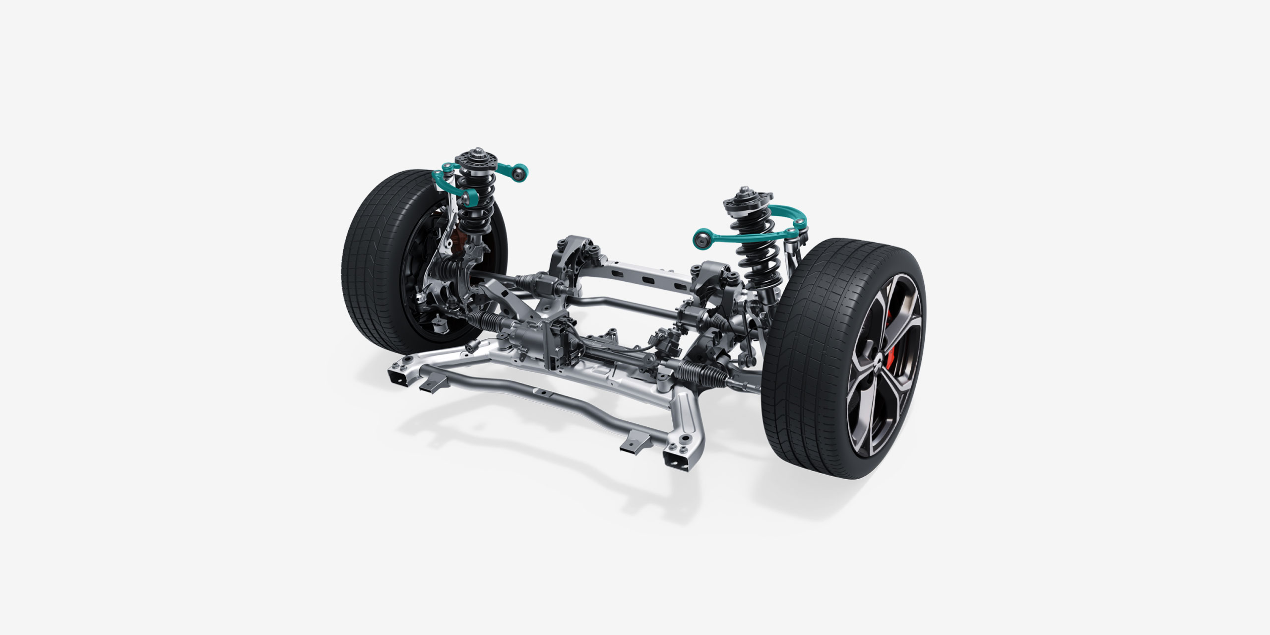 La suspensión delantera con eje de pivote virtual permite una arquitectura compacta que optimiza el espacio interior y, al mismo tiempo, gestiona de forma eficaz las altas demandas de torque durante aceleraciones y desaceleraciones rápidas.